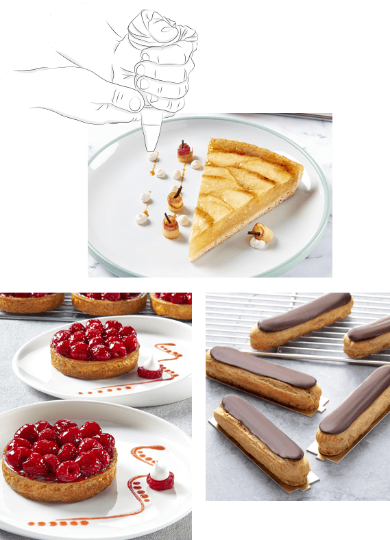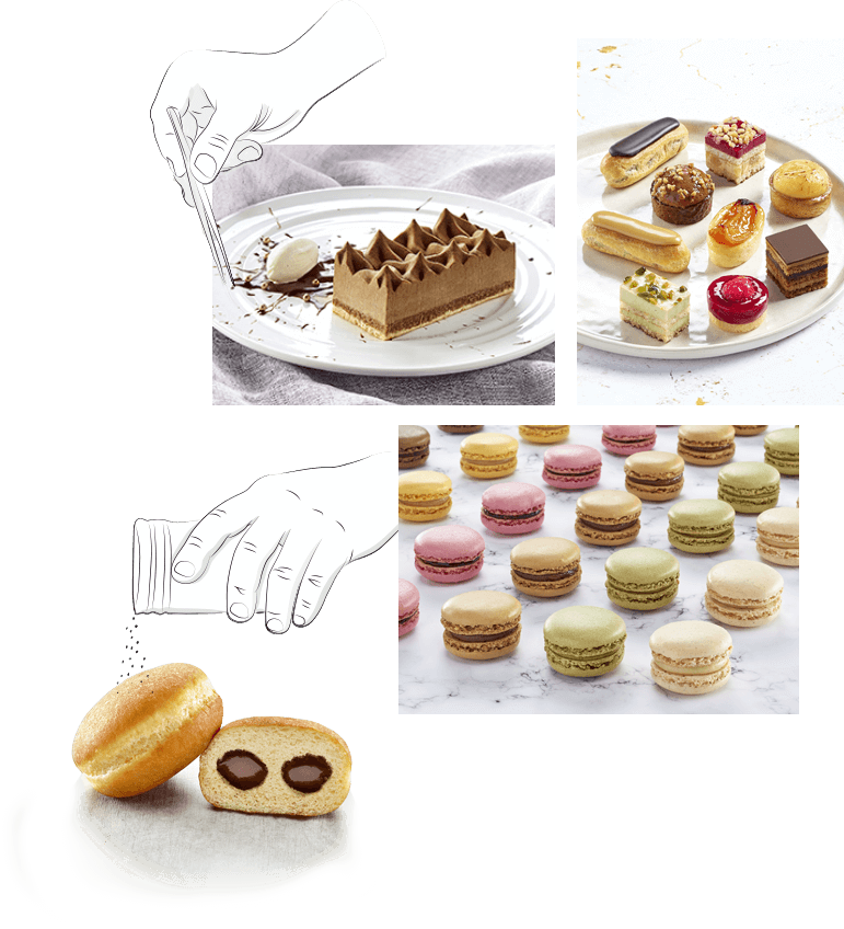Find our product ranges: Tartes, Tartelettes, Entremets, Choux Pastry, Doughnuts, Petits Fours and Macarons.