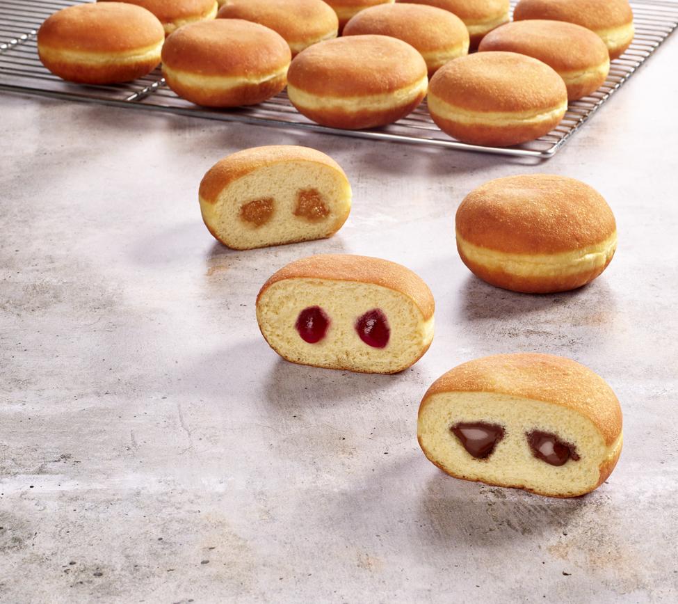 Pâte à beignet, fourrage parfum chocolat-noisette. (25% de fourrage parfum chocolat-noisette)