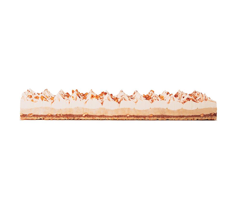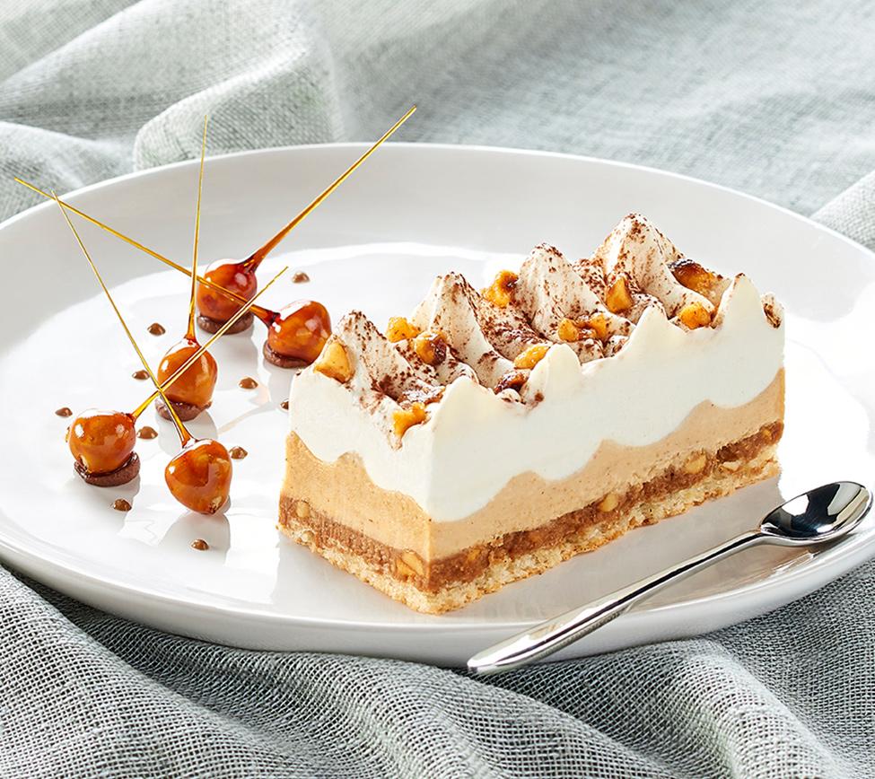 Biscuit aux amandes, croustillant au chocolat au lait et noisettes, mousse noisette et praliné, mousse à base de chantilly à la vanille, décor noisettes caramélisées. (17% de noisettes et 3% d'amandes)