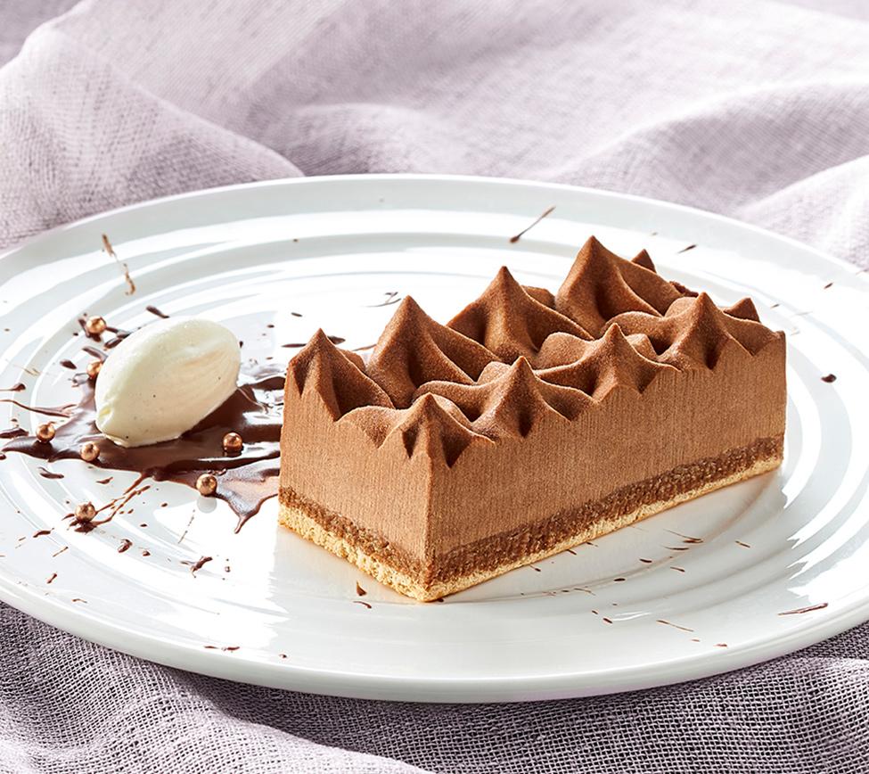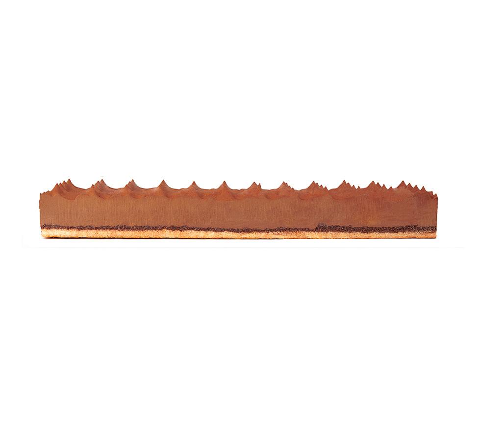 Biscuit moelleux, croustillant chocolat noir, mousse au chocolat noir intense, pochage cannelé et son décor velours cacao. (29% de chocolat)