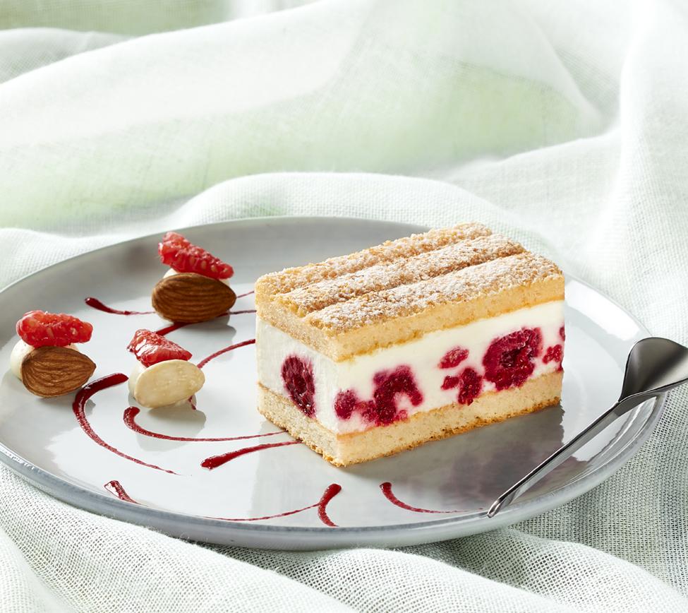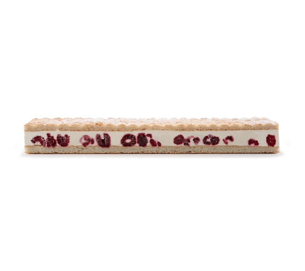 Biscuit moelleux, mousse vanille, framboises entières, biscuit aux amandes, décor noix de coco râpée. (22% de framboises)