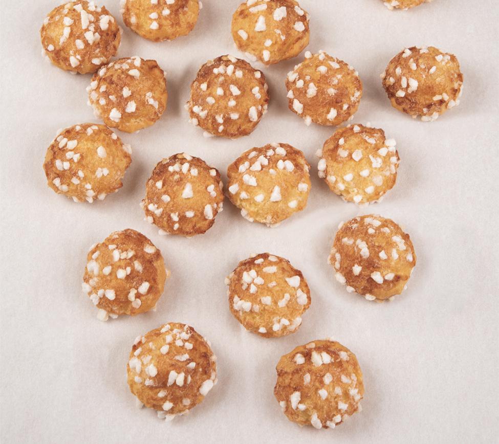 Pâte à choux aux œufs, grains de sucre. (Crue surgelée : 10 feuilles de 54 chouquettes)