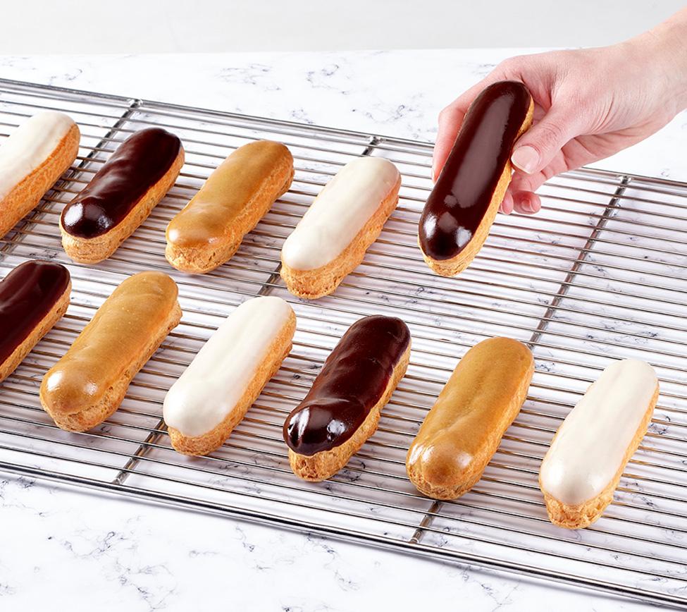 Pâte à choux aux œufs, garniture pâtissière, glaçage.