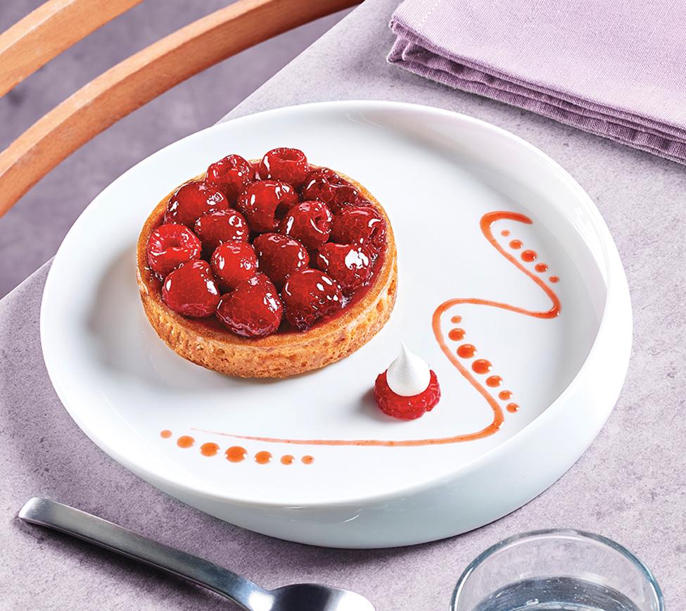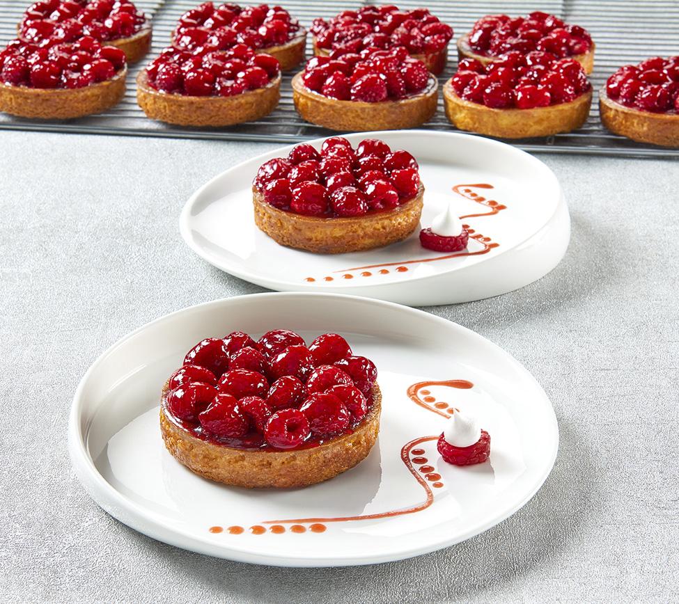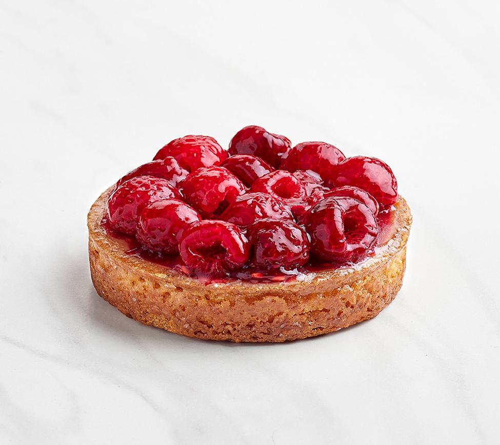 Pâte sucrée pur beurre, crème d'amande, framboises entières et gelée de fruits rouges. (30% de framboises)